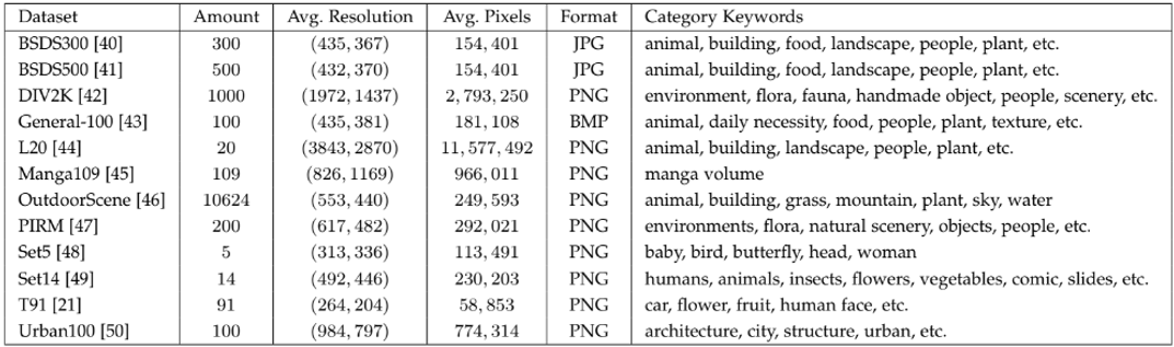 Table1 의 datasets 뿐만 아니라, ImageNet, MS-COCO, VOC2012, CelebA 등 다른 vision 분야에 사용되는 dataset도 SR에 활용 가능하다.