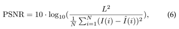 Ground truth 이미지 $I$가 주어졌을 때($N$은 pixel 개수), 복원된 이미지는 $\hat{I}$이고, PSNR은 수식 6으로 정의한다. 위 수식에서 $L$은 8bit 이미지의 경우 255를 의미한다.