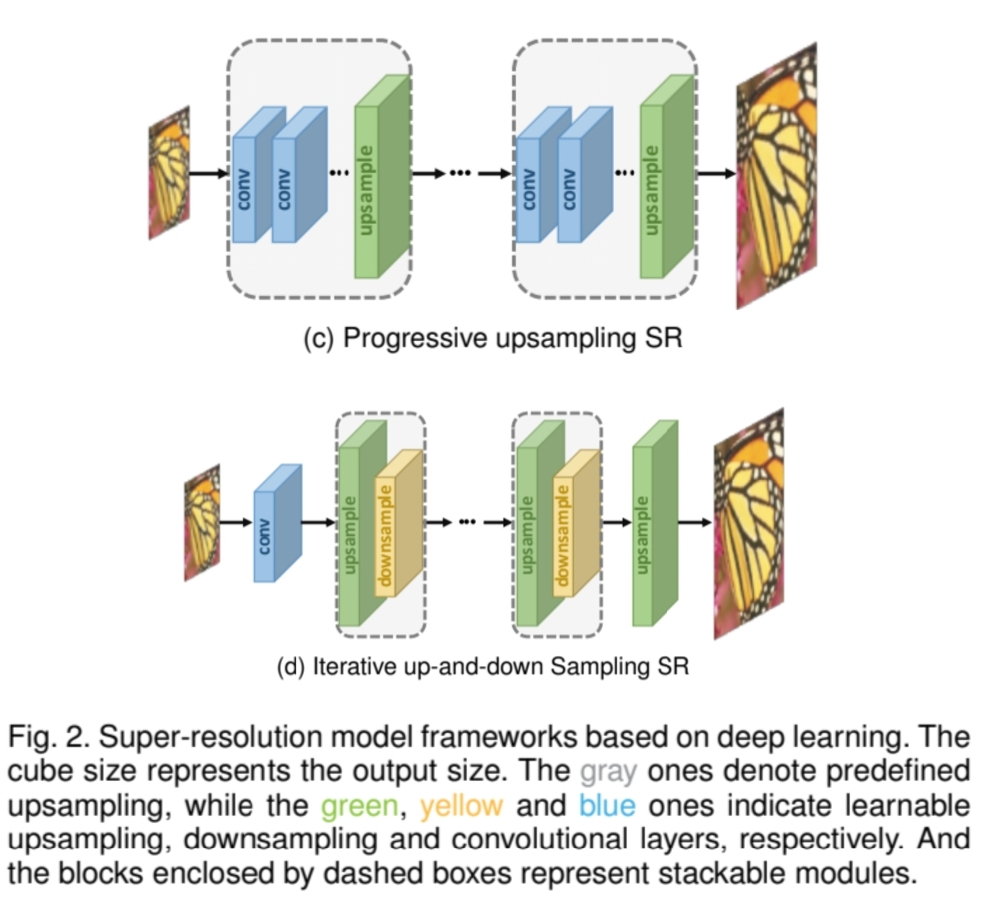 Image super-resolution은 문제가 잘 정의되지 않으므로, 어떻게 upsampling을 수행할 것인지가 핵심이다. 다양한 모델들의 구조가 있지만, 사용된 upsampling 방법과 모델 내의 위치에 따라 4개의 model frameworks로 구분할 수 있다(Fig.2)