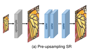 이 방법은 Dong et al.[22,23]의 연구에서 처음 제안된 방법으로 SRCNN에서 사용된 방법이다. Low-dimensional space에서 high-dimensional space로 바로 맵핑하여 학습하는 것이 어려운 관계로, 우선 upsampling 알고리즘을 사용하여 이미지를 원하는 크기의 고해상도로 1차적으로 변환하고(coarse HR images), 이 후에 딥러닝을 사용하여 이미지를 개선하는 방법이다.